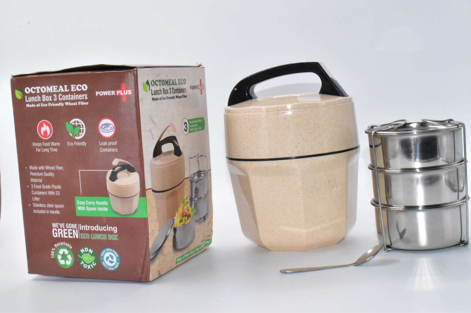 Octomeal Eco: 3 Steel container lunch box with spoon | Made from Eco friendly material | 100% recyclable -H197